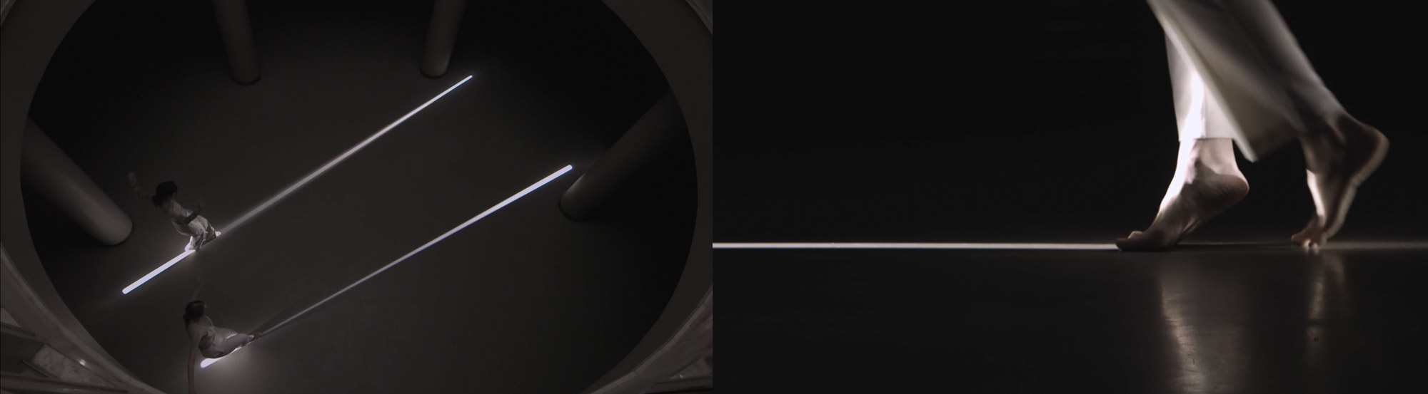 Performers are put into a conflict situation, in which the object is not tangible. Knowing that their walking partner is by their side evokes the feeling of non-verbal unity and is a symbol of the collective unconscious. Meanwhile, the strictly defined environment determines the movement of performers who unconsciously adjust to it: the narrow lighting path sets a pattern of behaviour for them and ultimately deprives the characters of the choice not to adapt.